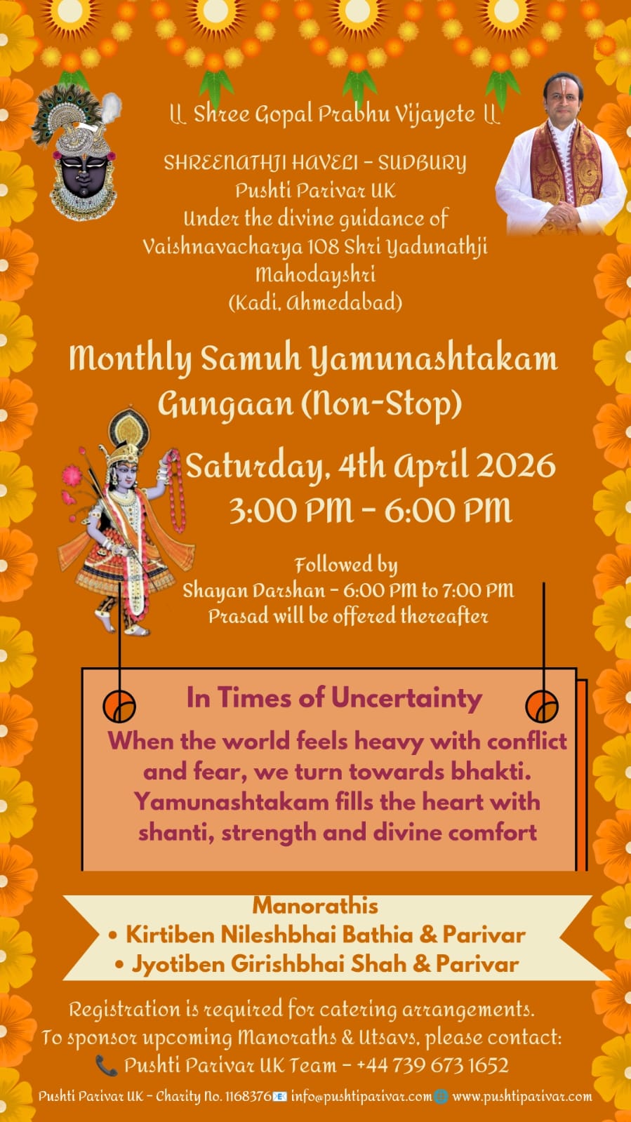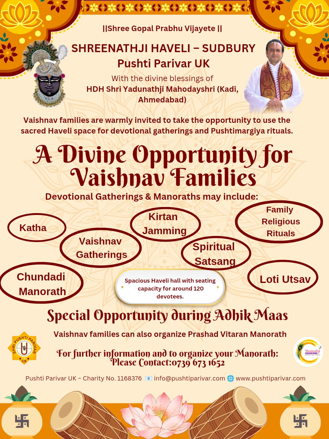 Pushti Parivar UK with blessings of HDH Shri Yadunathji Mahodayshri has established Shreenathji Haveli in London. The Haveli hosts a variety of events and activities, including Ekadashi Satsangs, Children’s Ashtakshar Chanting Classes, and Shree Yamunashtak recitations. One can also celebrate events like birthdays, Anniversaries, organise satsang and kirtans at the haveli and offer prasad prasad to attendees.